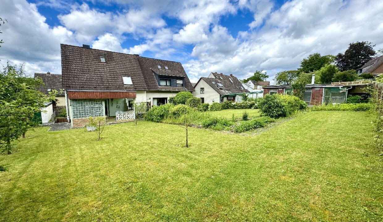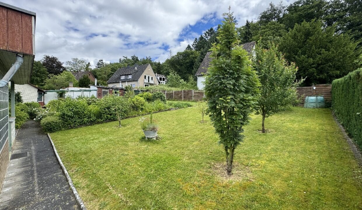 Besonders hervorzuheben ist der weitläufige, gepflegte Garten, der direkt an die überdachte Terrasse angrenzt. Der großzügige Außenbereich lädt besonders in den warmen Sommermonaten zu geselligen Abenden, Grillfesten oder entspannten Stunden im Grünen ein.