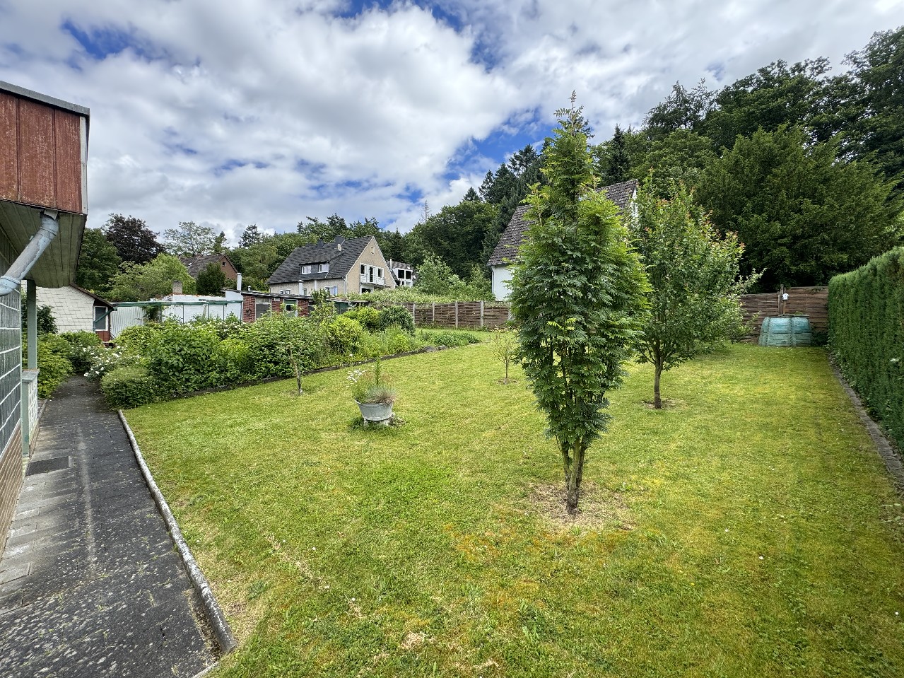 Besonders hervorzuheben ist der weitläufige, gepflegte Garten, der direkt an die überdachte Terrasse angrenzt. Der großzügige Außenbereich lädt besonders in den warmen Sommermonaten zu geselligen Abenden, Grillfesten oder entspannten Stunden im Grünen ein.
