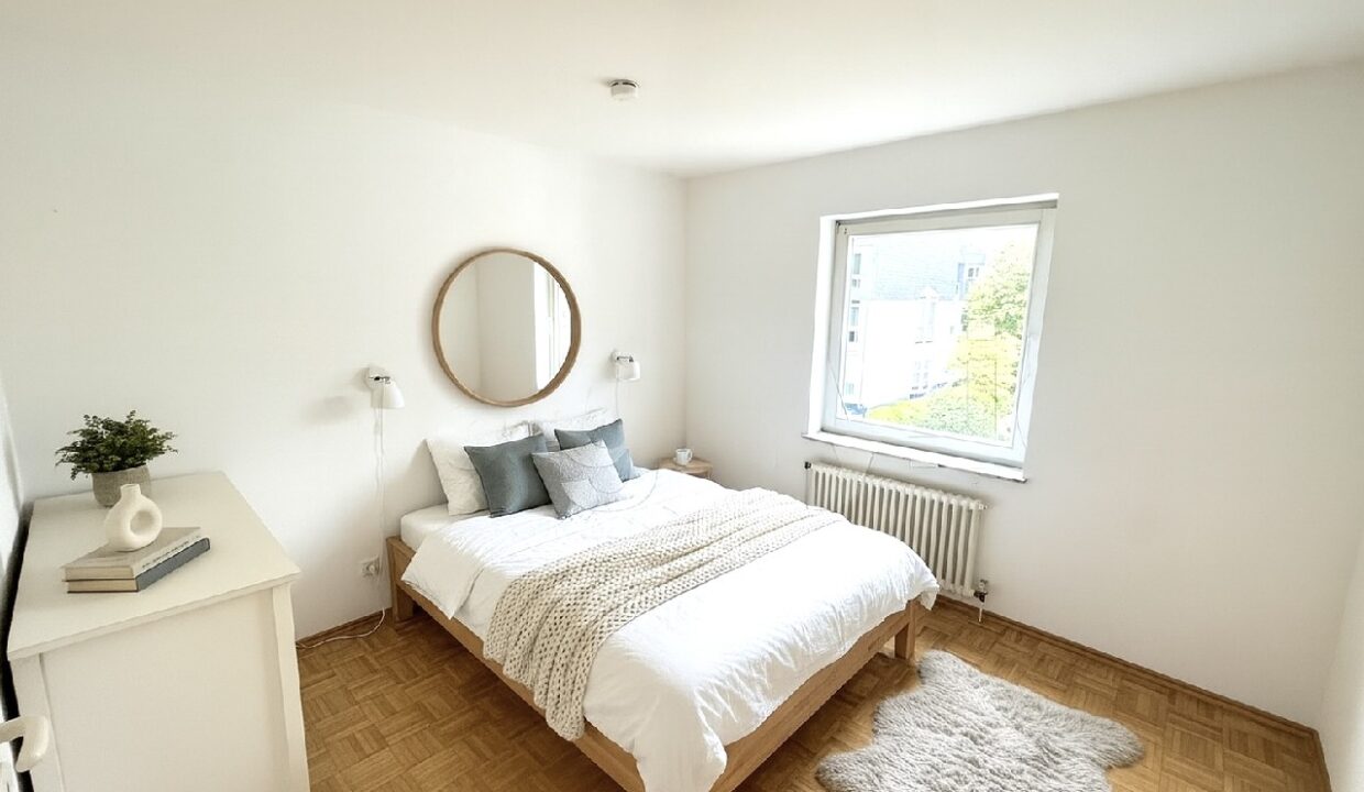 Das großzügige Schlafzimmer bietet genügend Platz für einen großen Kleiderschrank. Dank der durchdachten Raumaufteilung entsteht hier eine perfekte Balance zwischen Komfort und Privatsphäre.