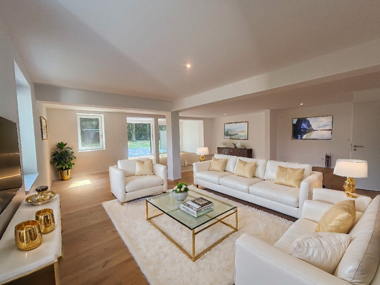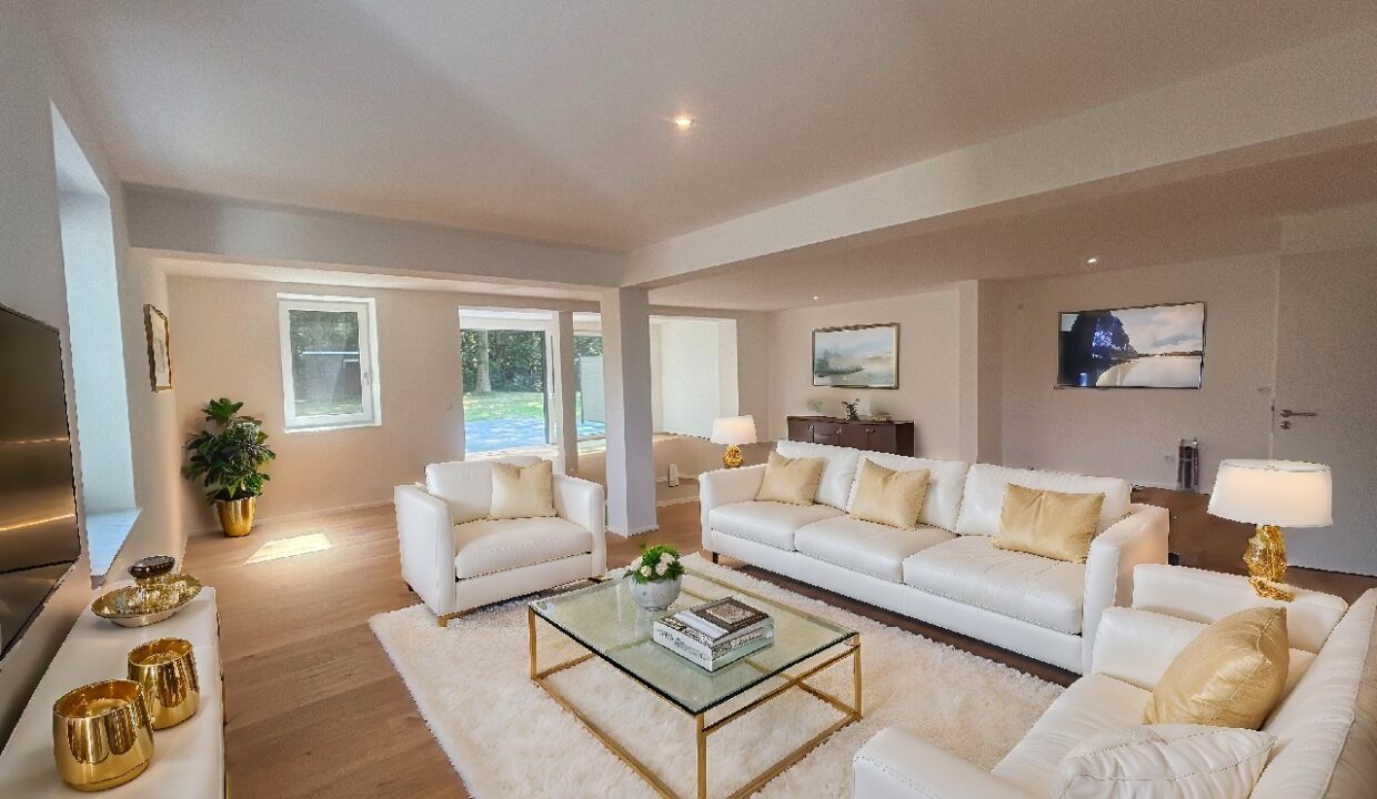 Die Wände sind weiß gestrichen, was den Raum hell und einladend erscheinen lässt. Der Boden ist mit hellem Parkett ausgelegt, welcher eine warme Atmosphäre schafft. Große Schiebetüren lassen viel natürliches Licht hereinfallen und bieten einen Blick auf den begrünten Außenbereich. Der Raum hat ein modernes Erscheinungsbild mit offenem Grundriss und einigen tragenden Säulen. Die eingelassenen Deckenleuchten verstärken das moderne Ambiente des Raumes.