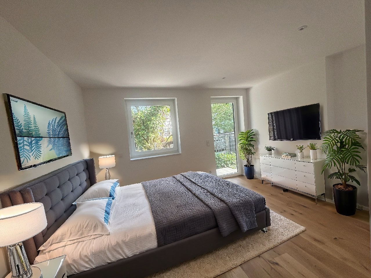 Das Schlafzimmer verfügt über einen zusätzlichen Balkon. Beenden Sie hier Ihren Tag mit einem Buch und einem guten Glas Wein. Direkt neben dem Schlafzimmer befindet sich das modern eingerichtete Badezimmer en suite, welches Ihnen mit einem Doppelwaschtisch, WC, Badewanne und einer großzügigen begehbaren Regendusche höchsten Komfort bietet.