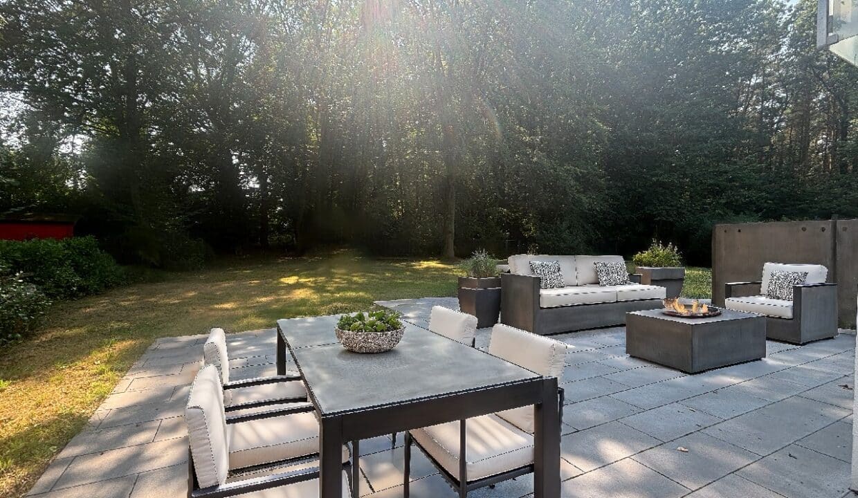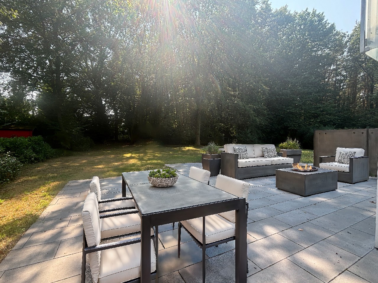 Zu der Wohnung gehört auch eine weitläufige Sonnenterrasse mit einem großen Gartenanteil von ca. 400 m², die neben einem wunderschönen Ausblick ins Grüne viel Platz für gesellige Stunden mit der Familie und Freunden bietet.