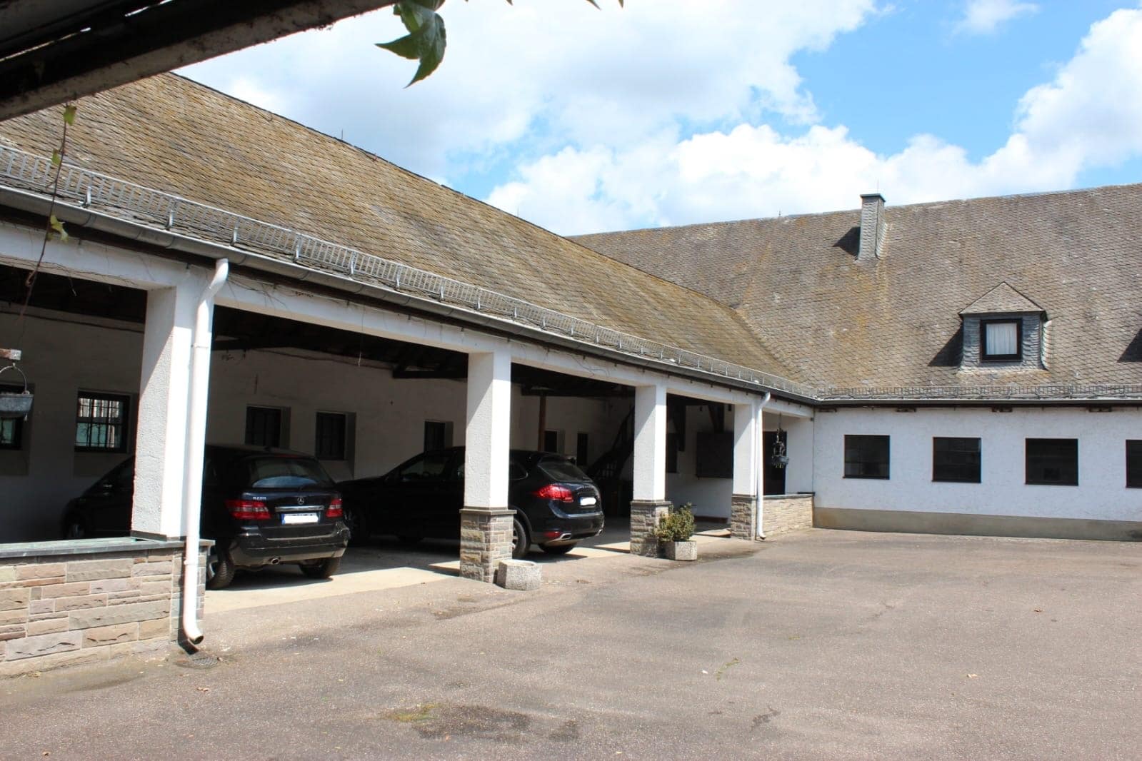 Die Anordnung der Gebäude mit dem zentralen Zugang ins Atrium beinhaltet verschiedene Wohnbereiche, eine Doppelgarage und eine Einzelgarage, Werkstatt, Unterstellbereiche, ein Schwimmbad mit anliegenden Nebenbereichen und Sauna sowie Ställe und Scheunenbereiche.