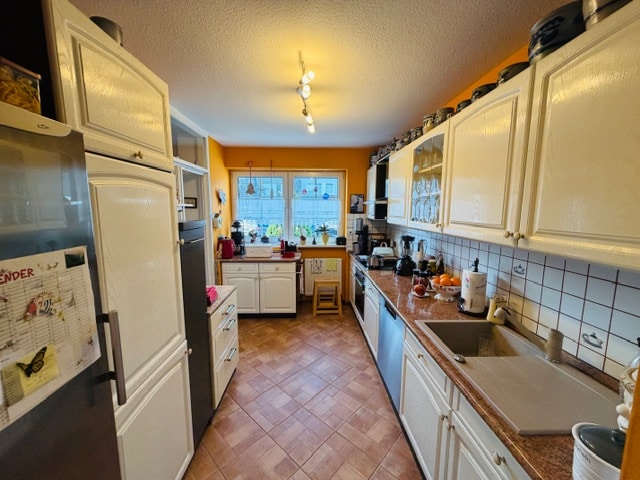 Im Erdgeschoss befinden sich neben dem großzügigen Wohn- und Essbereich mit angrenzendem Wintergarten eine komfortabel ausgestattete Küche mit Einbauküche und das Gäste-WC.